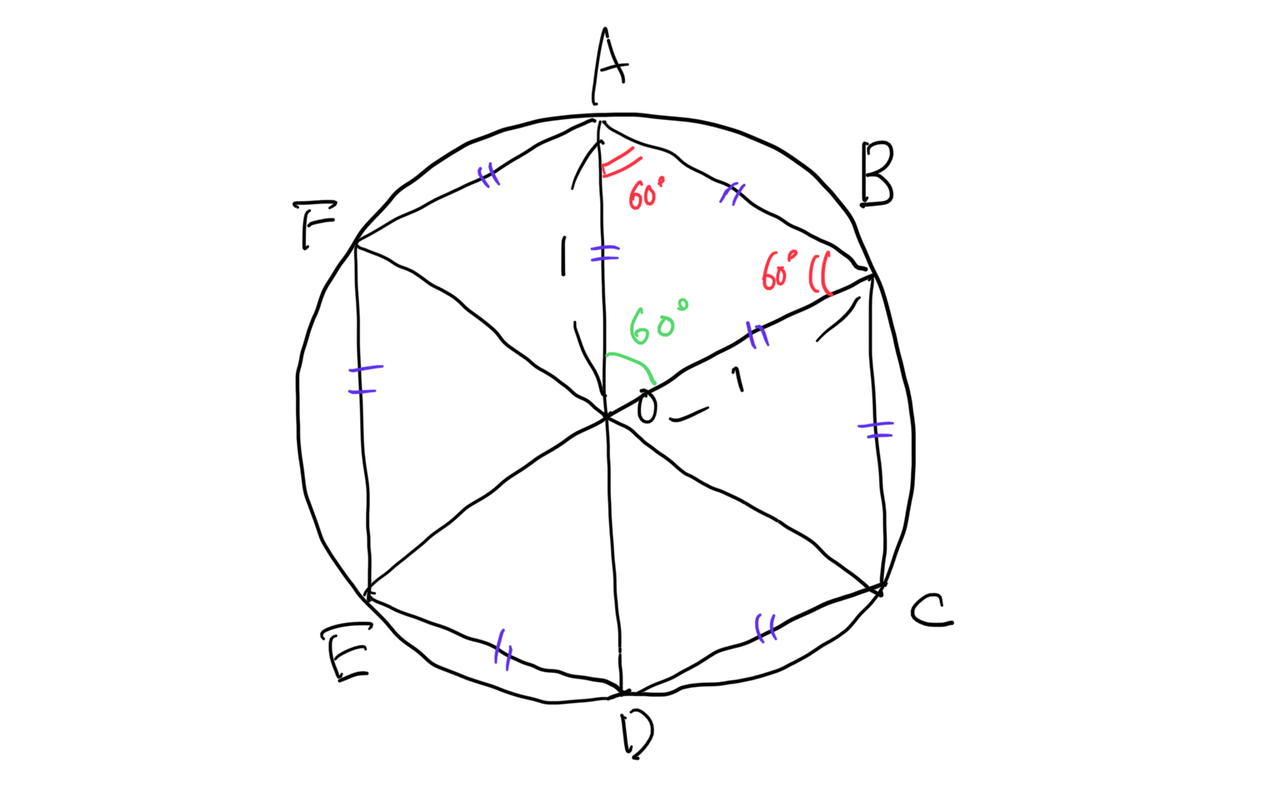 半径が1の円に六角形が内接されています。